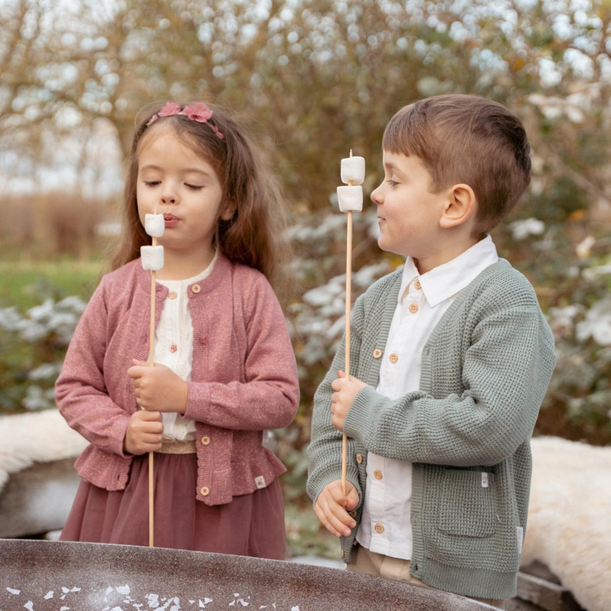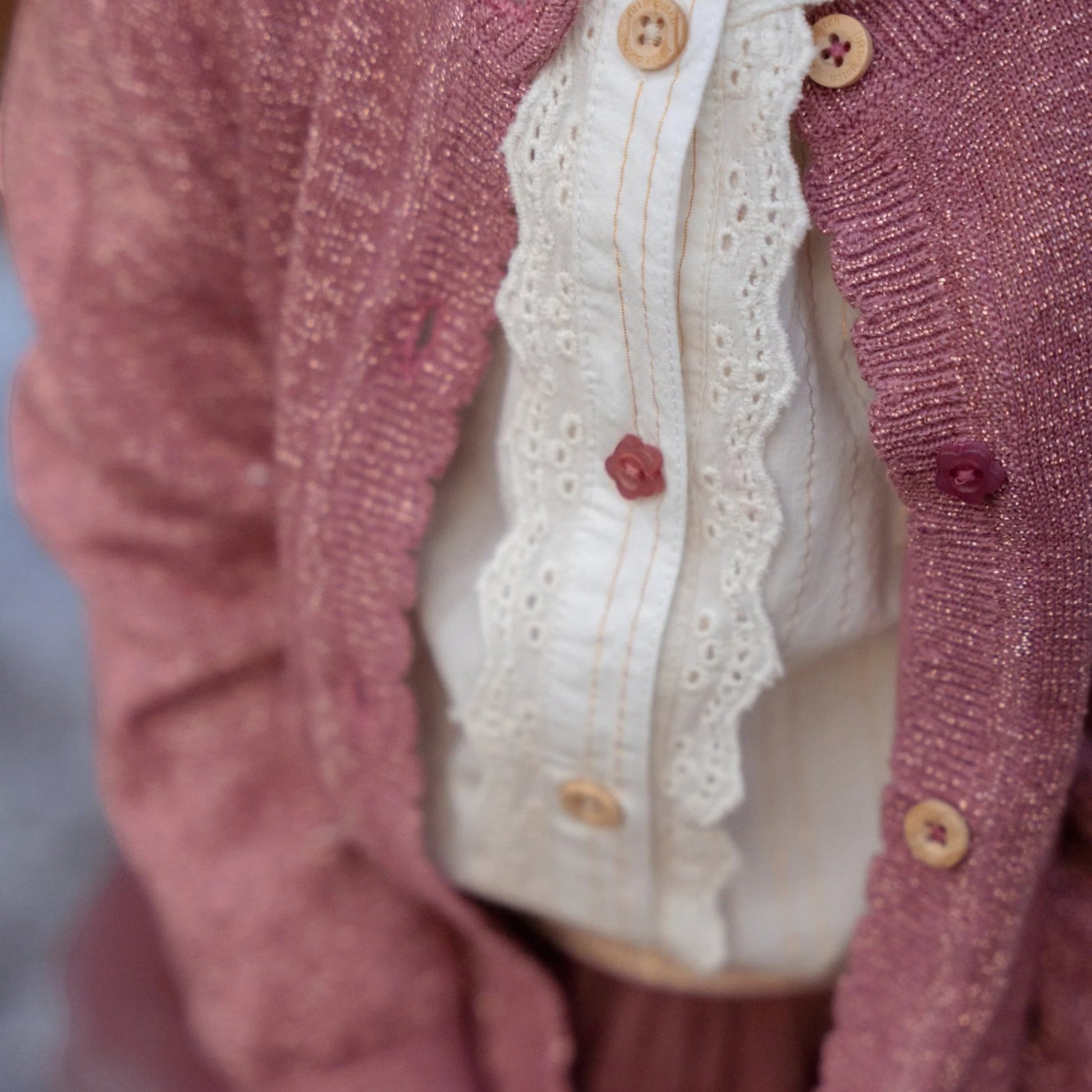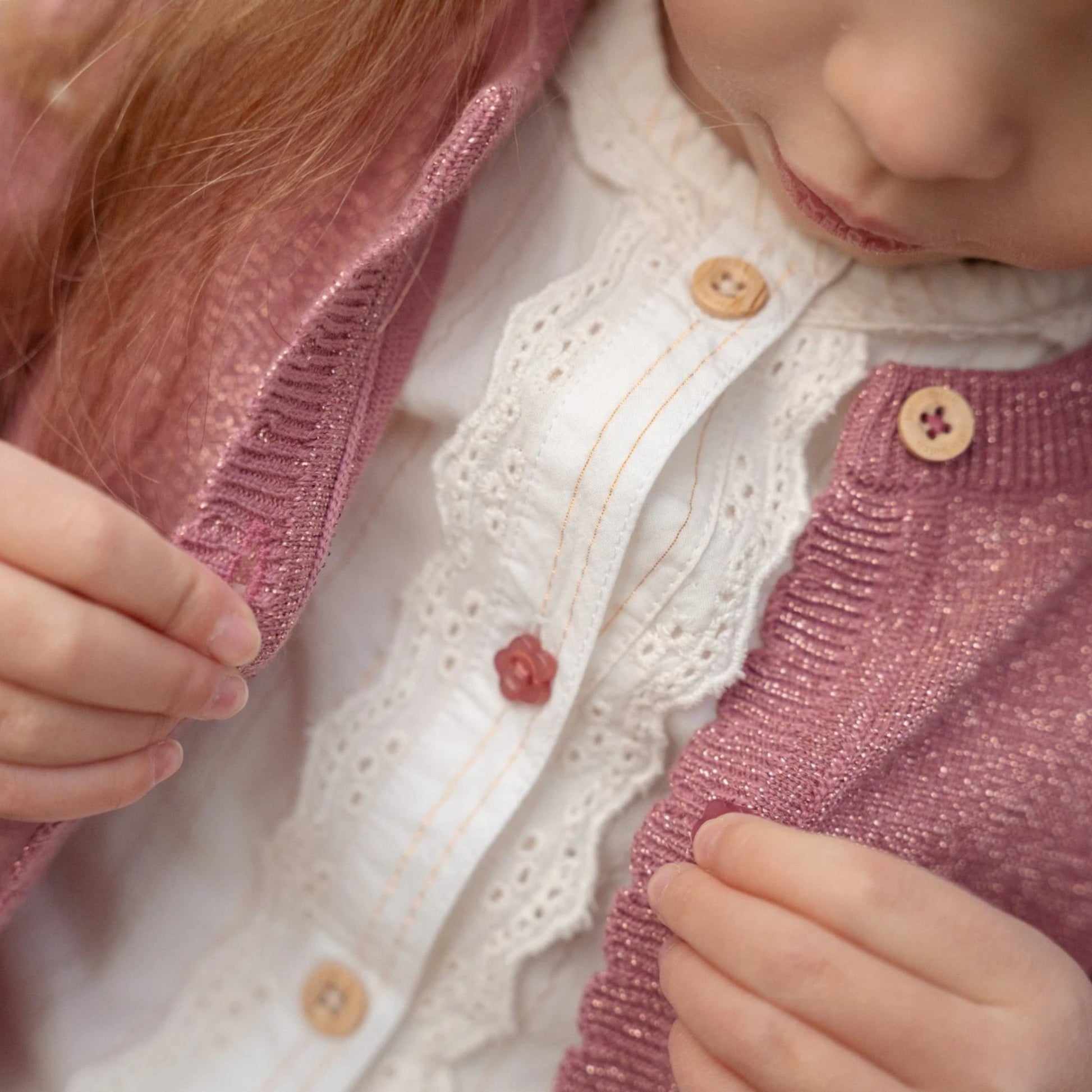 Τα γλυκά φρου-φρου γύρω από το γιακά και το κούμπωμα προσθέτουν παιχνιδιάρικη κομψότητα, ενώ τα κουμπάκια με όψη ξύλου και το μοναδικό κουμπι σε σχήμα λουλουδιού χαρίζουν μια ξεχωριστή λεπτομέρεια. Διαθέσιμο σε μεγέθη 74, 80, 86, 92, 98 και 104.