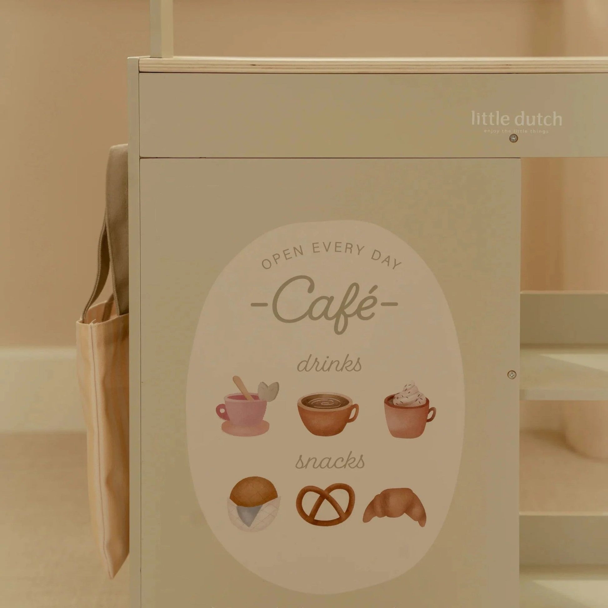 Κι εδώ είναι η έκπληξη, αν γυρίσετε τον πάγκο, μετατρέπεται σε ένα ζεστό καφέ, με μενού και χαρούμενες εικονογραφήσεις. Συνδυάστε το με ταμειακή μηχανή, ζυγαριά ή πιατέλα γλυκών για ατελείωτο παιχνίδι ρόλων.