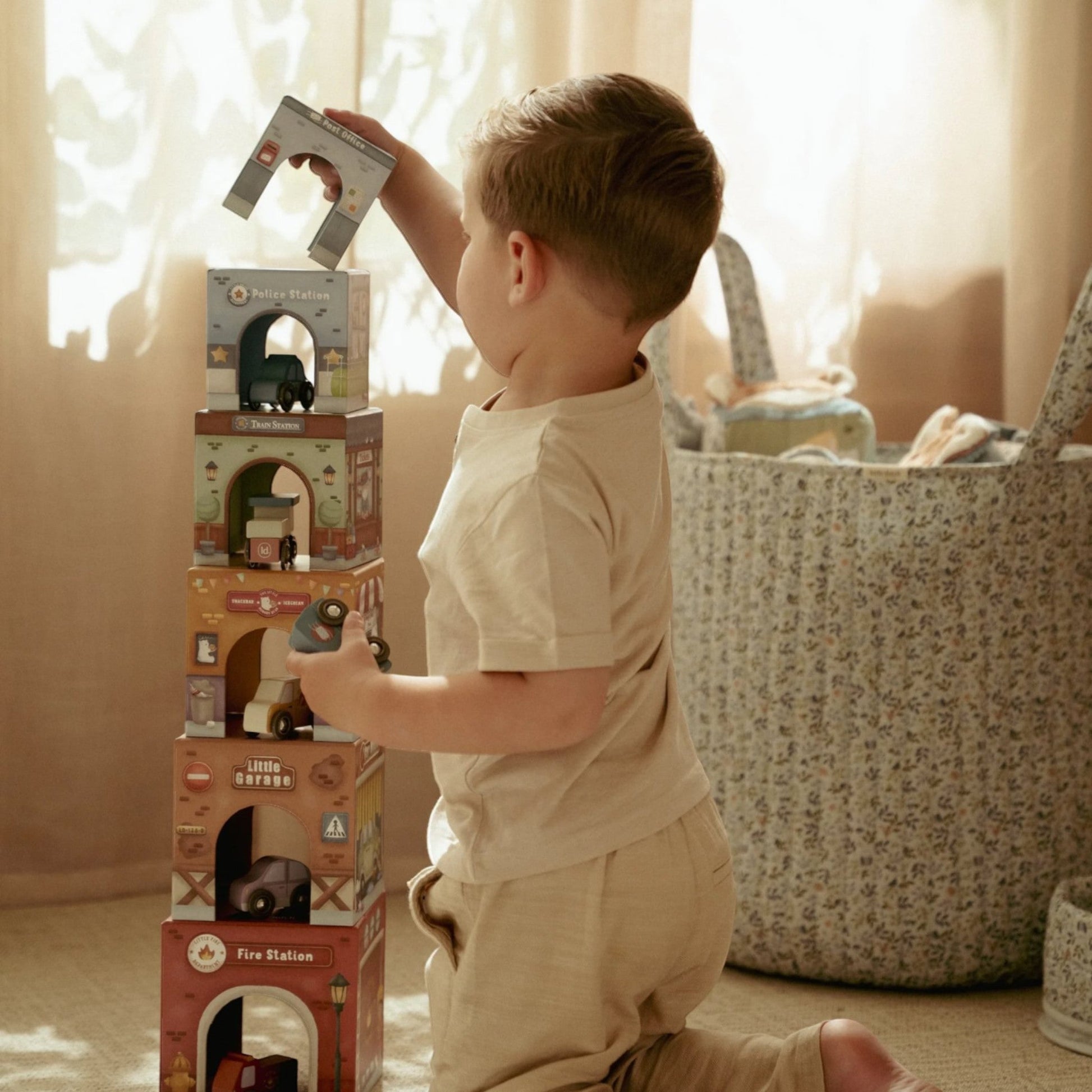 - Περιλαμβάνει 6 κύβους από ανθεκτικό χαρτόνι με πιστοποίηση FSC και ξύλινα αυτοκινητάκια.