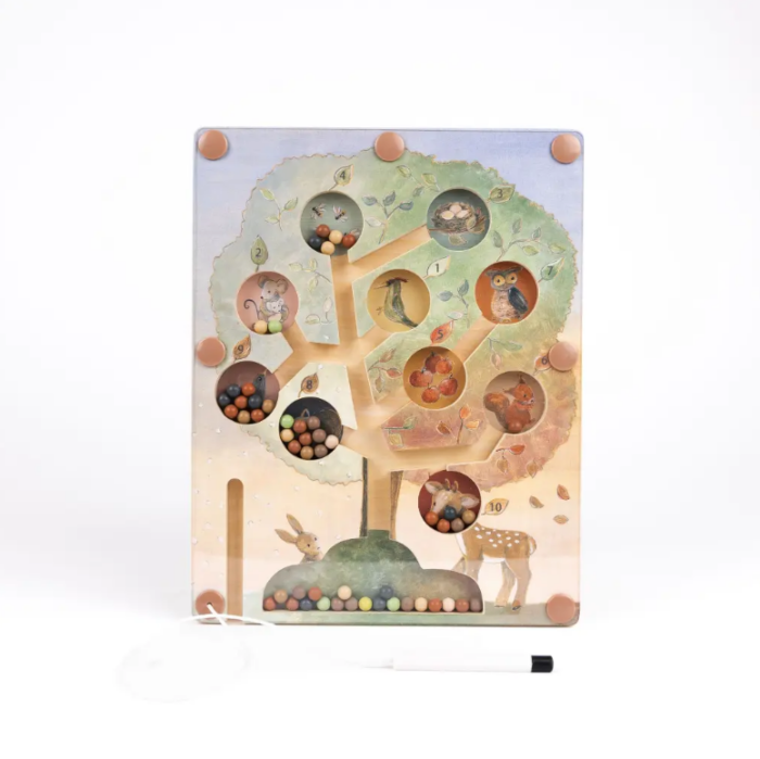 Μάθε μέσα από το παιχνίδι με αυτόν τον υπέροχα εικονογραφημένο μαγνητικό λαβύρινθο χρωμάτων σε σχήμα δέντρου! Με τη μαγνητική γραφίδα, τα παιδιά καθοδηγούν τις χρωματιστές μπίλιες στους αντίστοιχους θαλάμους, ενισχύοντας τη λεπτή κινητικότητα, την αναγνώριση χρωμάτων, τον συντονισμό χεριού-ματιού και τη συγκέντρωση. Ο ασφαλής σχεδιασμός με τις μπίλιες κλεισμένες στο εσωτερικό και τη γραφίδα δεμένη με κορδόνι το κάνει ιδανικό για ήρεμο παιχνίδι στο σπίτι ή για απασχόληση στο ταξίδι.