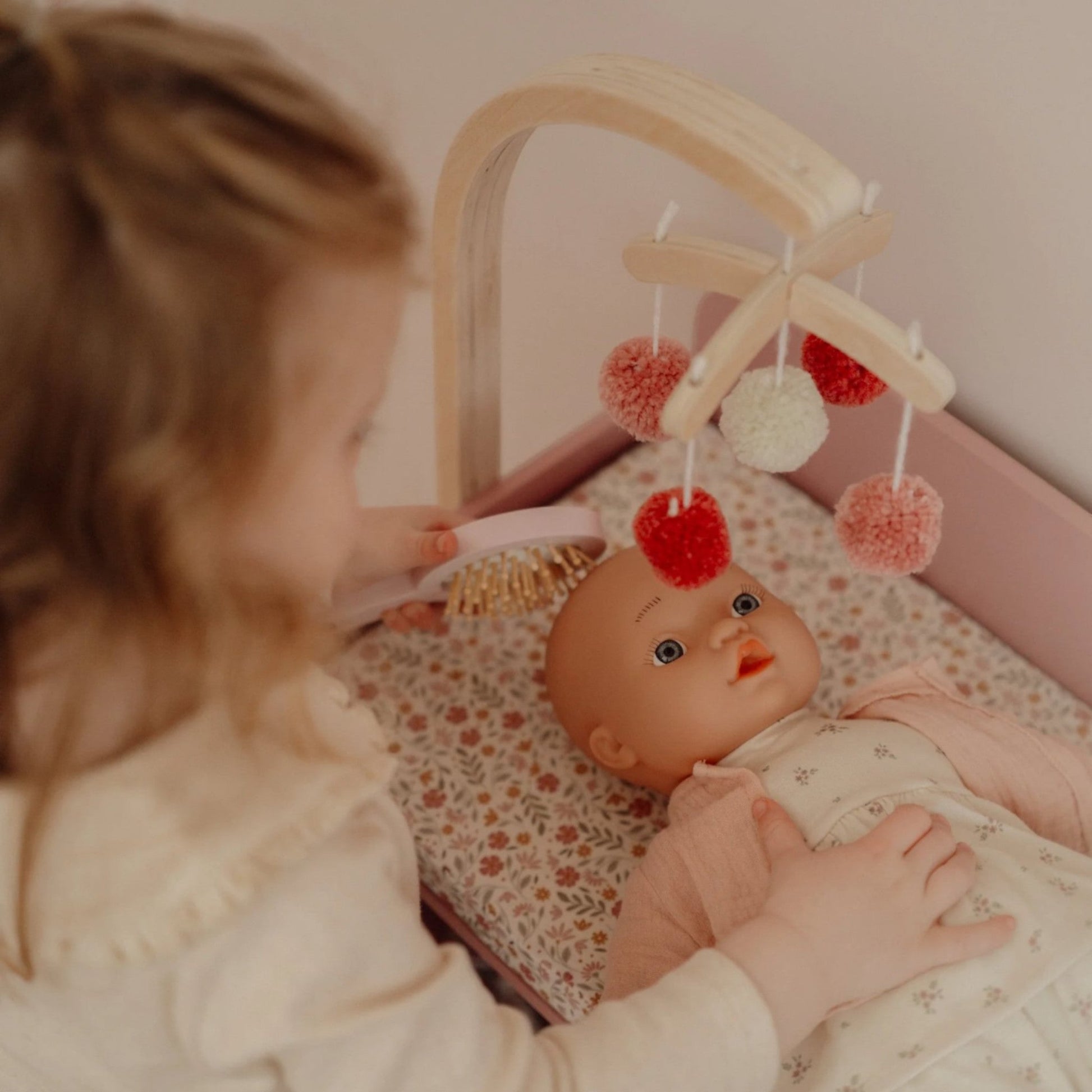 Περιλαμβάνει ένα απαλό στρωματάκι αλλαγής με ονειρικό σχέδιο, ένα παιχνιδιάρικο μόμπιλε, καθώς και ξύλινα αξεσουάρ περιποίησης που συμπληρώνουν την εμπειρία.